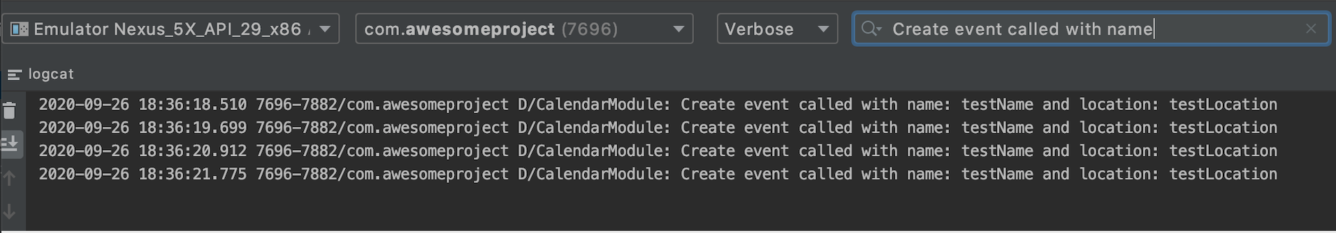 At this point, you have set up the basic scaffolding for your native module in Android. Test that out by accessing the native module and invoking its exported method in JavaScript.